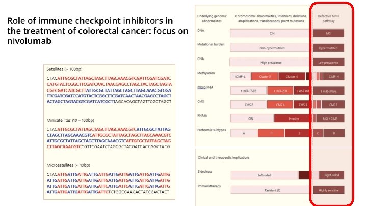 d. MMR/MSI-H § ~15% de CRCs tempranos d. MMR/MSI-H 1 § ~4– 5% de CRCs metastásicos d. MMR/MSI-H 1 d. MMR/MSI-H in CRC d. MMR/MSI-H en CRC hereditario (Síndrome de Lynch ) 2 d. MMR/MSI-H en CRC esporádico 2 • 10– 15% de cancer de colon esporádicos • Raro en cancer rectal • Mutación BRAF (V 600 E) asociada • 3% de todos los CRCs 1 • Mutación de genes 2: • MLH 1 (42%) • MSH 6 (18%) • PMS 2 (7%) • MSH 2 (33%) • Sme Lynch asociado con alto riesgo CRC 2 CRC=colorectal cancer; d. MMR=deficient mismatch repair; MSI-H=microsatellite instability high; MLH 1=mut. L homolog 1; MSH 2=mut. S protein homolog 2 1. Sinicrope FA, Sargent DJ. Clin Cancer Res. 2012; 18(6): 1506 -12. 2. Richman SD. Int J Oncol. 2015; 47(4): 1189 -1202.