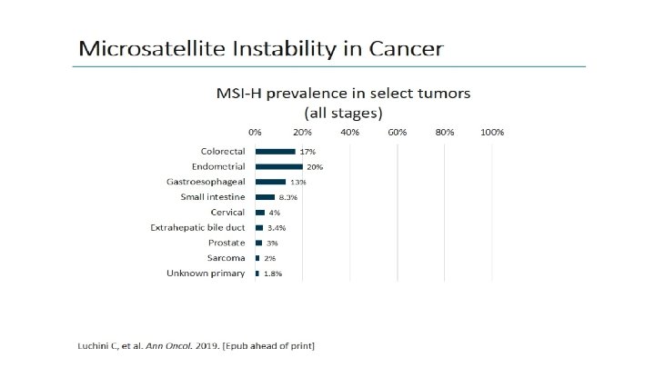 Metodos: IHC vs PCR 1, 2 • • • IHC y PCR tienen la misma especificidad y sensibilidad para detectar MSI tumoral Ambos tienen un 5%– 10% de falsos negativos Heterogeneidad en el Mercado de cómo se combinan MMR MSI Inestabilidad microsatelital 1, 3, 4 1, 2, 5 Genes reparadores del ADN Metodo • IHC • PCR Hallazgo • Presencia o ausencia de proteinas de reparación • Presencia o ausencia de mutaciones del ADN Ventajas • • • Bajo costo Baja tecnología Rápido resultado • • Test único Kit disponible (Promega) • Depende de la interpretación del patólogo (tinción/interpretación) Muchos anticuerpos disponibles para cada proteína • • • Más caro Tarda más el resultado Requiere un tejido de control normal (tejido o sangre) Desventajas • d. MMR, deficient mismatch repair; DNA, deoxyribonucleic acid; MSI-H, high microsatellite instability. 1. Richman R. Int J Oncol. 2015; 47: 1189 -1202. 2. Van Cutsem E. Ann Oncol. 2016; 27: 1386 -1422. 3. Promega. Accessed December 14, 2016. 4. Quest Diagnostic. Accessed December 14, 2016. 5. ARUP. Accessed December 14, 2016.