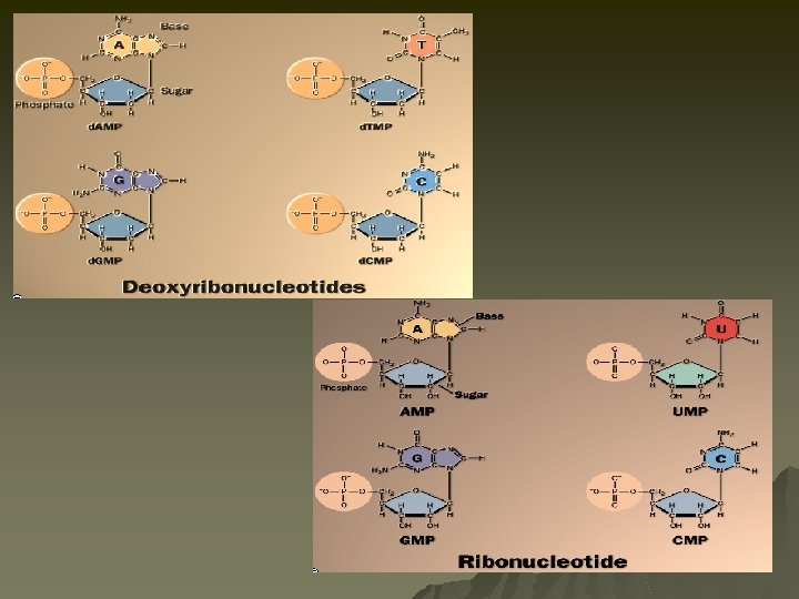 u Terdiri dari 2 golongan : – Ribonukleotida – Deoksiribonukleotida u Jenis nukleotida : – Nama tergantung pada basanya – Jumlah fosfat yang dimiliki Adenin Guanin Sitosin Timin Urasil AMP, ADP, ATP, d. AMP, d. ADP, d. ATP GMP, GDP, GTP, d. GMP, d. GDP, d. GTP CMP, CDP, CTP, d. CDP, d. CTP TMP, TDP, TTP, UMP, UDP, UTP, d. UMP, d. UDP, d. UTP