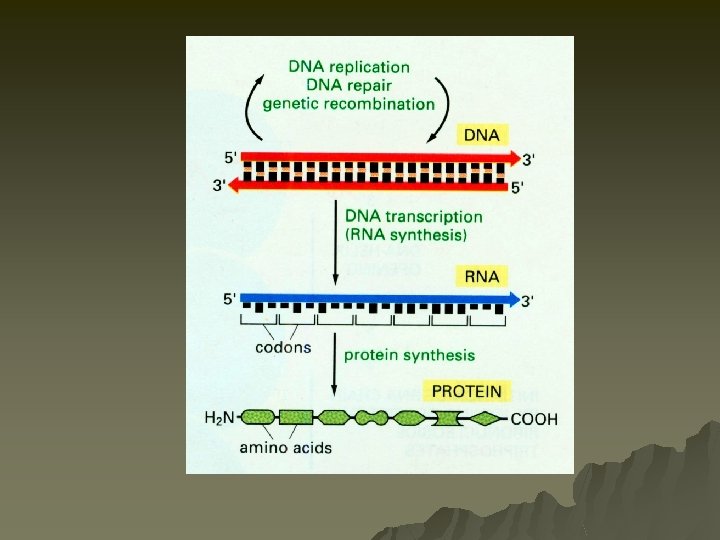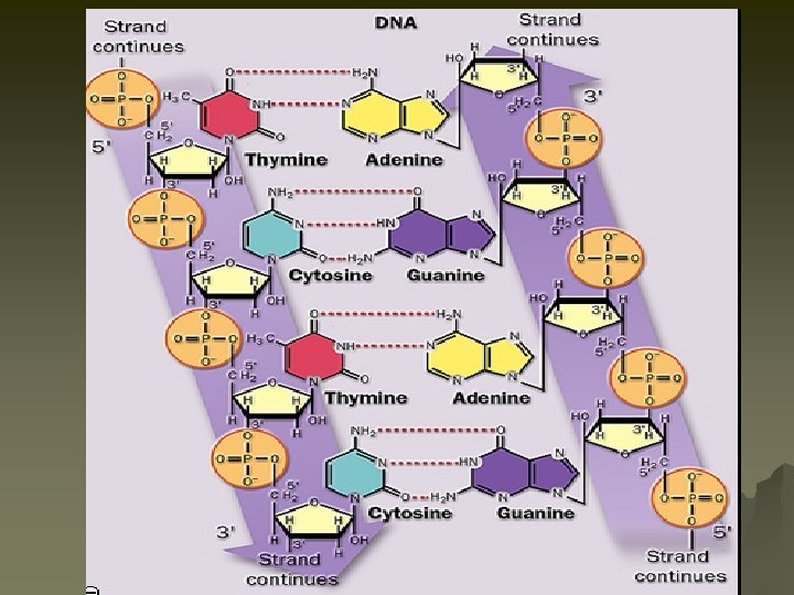 DNA (Deoxyribo. Nucleic Acid ) u Dikenal sebagai materi genetik u Merupakan komponen kromosom u Merupakan polimer deoksiribonukleotida yg dihubungkan dengan ikatan fosfodiester u Backbone (rangka) terdiri dr: gugus fosfat dan gula yg saling berseling u Memiliki orientasi 5’ 3’ jk gugus fosfat dr C 5 berikatan dgn OH C 3