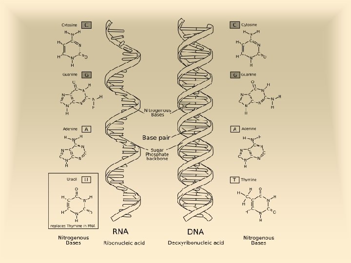 Základné informácie zákl. zložky kondenzácia nukleotid kondenzácia polynukleotid v RNA ≠ v DNA ZÁSADA + SACHARID + FOSFÁT nukleozid nukleotid