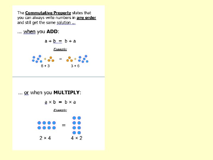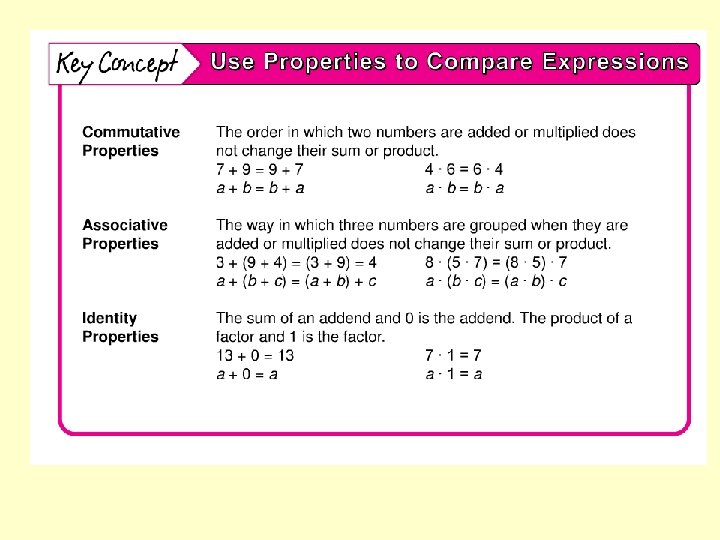 Number Properties • What? Today we will review the Commutative, Associative, Distributive and Identity Properties. • Why? They can help us simplify, and solve mathematical equations and inequalities. • Connection to previous material? You may have already learned how to use the properties with numeric expressions, but not with algebraic expressions.
