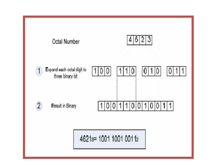 BINARY TO OCTAL CONVERSION • Can be converted by grouping the binary bit in group of three starting from LSB • Octal is a base-8 system and equal to two the power of three, so a digit in Octal is equal to three digit in binary system.