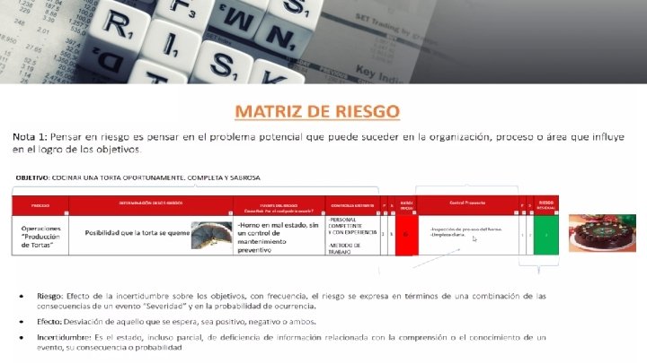 VAMOS A PRACTICAR • PASO 1: IDENTIFICACIÓN DEL RIESGO OBJETIVO: Cocinar una torta completa, sabrosa y de entrega oportuna. ¿QUÉ PUEDE SER UN POTENCIAL RIESGO EN LA PREPARACIÓN DE LA TORTA?