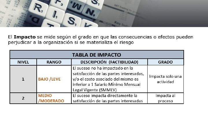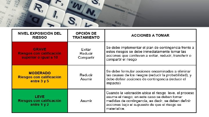 ENTENDIENDO EL RIESGO • ¿Qué piensas cuando escuchas la palabra “riesgos”? • Es un problema • Es algo que puede suceder y te daña • Es algo que afecta tus metas y objetivos