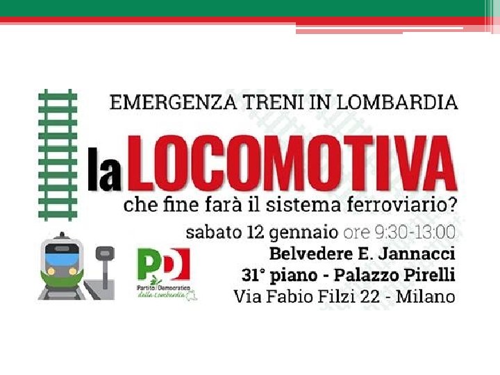 Le nostre proposte per cambiare passo Da subito Ø GESTIRE la situazione lombarda come emergenza nazionale attivando le procedure per avere treni da altre regioni e da altri Paesi UE Ø CAMBIARE la governance delle società Trenord In prospettiva Ø REALIZZARE una gara europea e mettere in competizione la gestione del servizio con standard europei, migliorandone la qualità Ø RINNOVARE la rete ferroviaria per una maggiore sicurezza ed efficienza Ø REINVESTIRE nella flotta di treni regionali Ø RIQUALIFICARE le stazioni