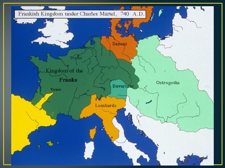 The Battle of Tours • 700 s: Muslims expanded into North Africa, Spain, and then France • Charles “Martel” (“The Hammer”) was a Frankish military leader who had power over the King • Charles Martel united Franks and creates a trained and disciplined army, unlike typical Germanic “barbarian hordes” which surprised the Muslims • 732 - The Battle of Tours: Franks defeated the invading Muslims and drove them back to Spain
