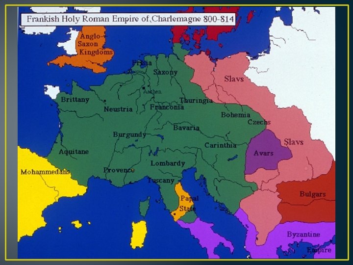 Great? • • Charlemagne = Charles the Great Grandson of Charles Martel Becomes King of Franks in 768 Built empire across France Germany Italy Poland Switzerland • 799 - helped Pope Leo III defeat his opponents in Rome • Christmas 800 - Pope crowned him “Emperor of Rome” • So… Christian Pope declares Germanic King the Roman Emperor… and Christendom (Christian