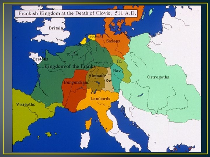 Rise of the FRANKS! • 486 - Clovis, King of the Franks, Conquered Gaul (which later became France) • Converted to Catholic Christianity, became allied with Pope, used religion as an excuse to kill and conquer pagan and heretical tribes • Put conquered people in army to make them loyal to him • Murdered all extended family so no one could challenge him for