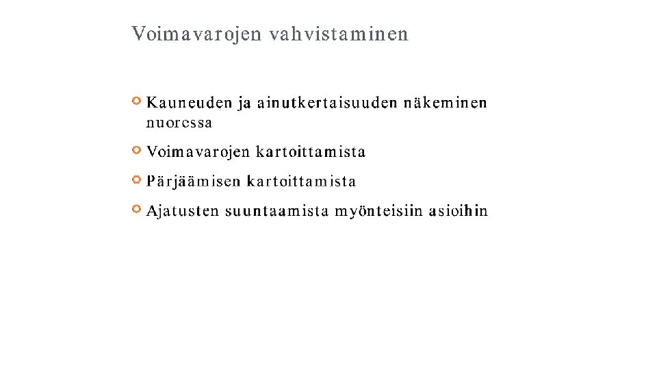 OMIEN TARPEIDEN KUUNTELU JA MUIDEN TARPEIDEN HUOMAAMINEN • Yksinkertaisimmillaan se on sitä että huomaa milloin itsellä on nälkä, milloin väsyttää ja milloin on tarvetta esim. liikunnalle. • Itsearvostusta – kykyä rakastaa itseään, hyväksyä itsensä ja uskoa omiin mahdollisuuksiin • Omien tarpeiden kuuntelu on itsestä huolehtimista • Omien tarpeiden kuuntelu on yhteydessä jämäkkyyteen