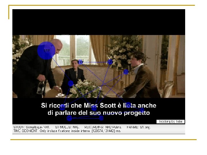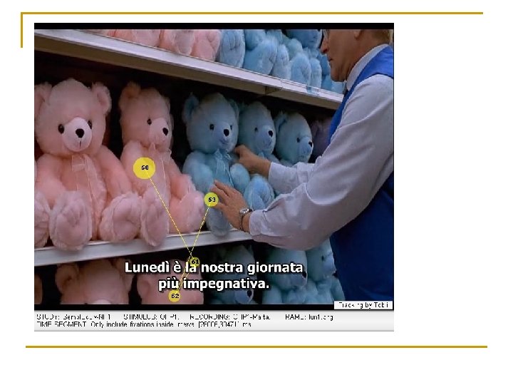 L’esperimento Obiettivi Comprensione generale Ricordo delle scene Ricordo dettagli visivi specifici Valutazione e gradimento dell’AD AD guida l’attenzione? Tracciamento oculare