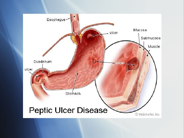 • Nursing Interventions cont’d: –Treament Regimen: • Explain the pathophysiology of the disease and how it relates to anatomy and physiology to help the patient understand the disease. • Discuss lifestyle changes that may be required to prevent future complications and/or control the disease process. • Instruct patient on which signs and symptoms to report to the health care provider to ensure early initiation of treatment. –Hemorrhage/Bleeding: • Assess for evidence of hematemesis, bright red or melena stool, abdominal pain or discomfort, symptoms of shock (decreased BP, cool/clammy skin, dyspnea, tachycardia, decreased urine output) • If ulcer is actively bleeding, observe NG tube aspirate or emesis for amount and color to assess degree of bleeding. • Take vital signs every 15 -30 mins to help determine patient’s hemodynamic status and as indicators for shock. • Maintain IV infusion line to provide ready access for blood and fluid replacement. • Monitor hematocrit and hemoglobin as indicators of severity of hemorrhage and need for fluid and blood replacement.