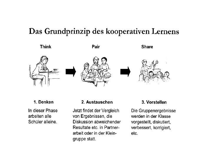 Drei Wege zur Schüleraktivität 1. Konkurrenz – ich anstatt du - mein Erfolg hängt davon ab, dass ich besser bin als du. - man kümmert sich mehr um sich selbst. - Vergleich zwischen Personen 2. Individualistisch – ich allein - Erfolg ist unabhängig vom Erfolg oder Misserfolg anderer. - individuelle Verantwortlichkeit. 3. Kooperation – wir statt ich - der Gruppenerfolg hängt vom Erfolg aller ab. - Sorge um andere - individuelle und Gruppen-Verantwortlichkeit.