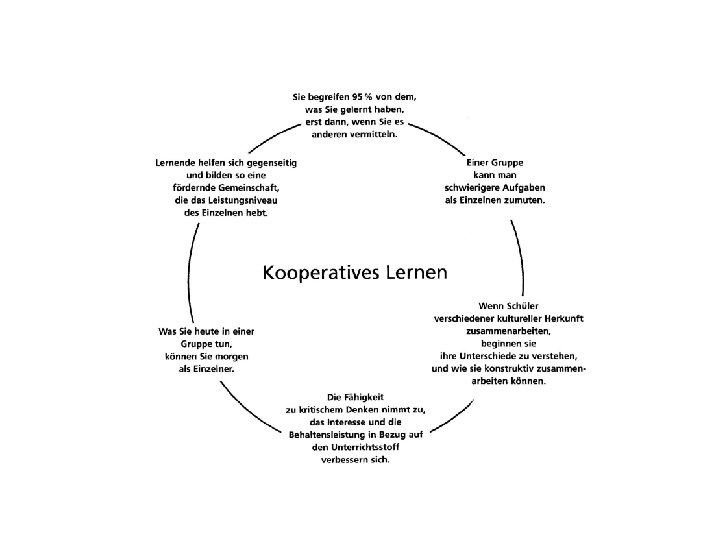 Kooperatives Lernen vs. Gruppenarbeit • keine geplante positive Abhängigkeit („Zweckgemeinschaft auf Zeit“) • keine teambildenden Aktivitäten • homogene Gruppenzusammensetzung • jeder ist für sich verantwortlich • soziale Fertigkeiten werden vorausgesetzt