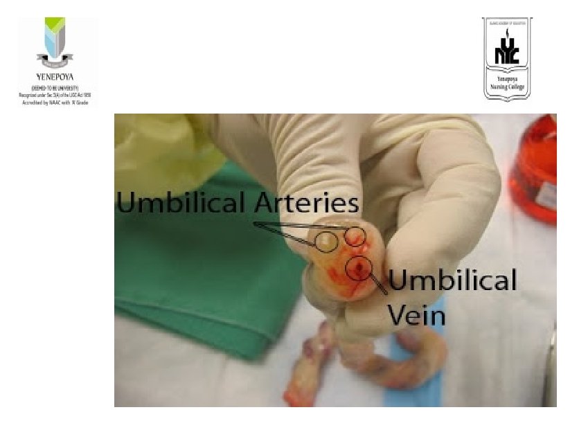 UMBILICAL CORD • The connection between the fetus and the placenta • It is a bluish white gelatinous structure at birth. • It normally contains 2 umbilical arteries and 1 umbilical vein encased in wharton`s jelly. • The presence of these structure should be determined when the cord is cut.