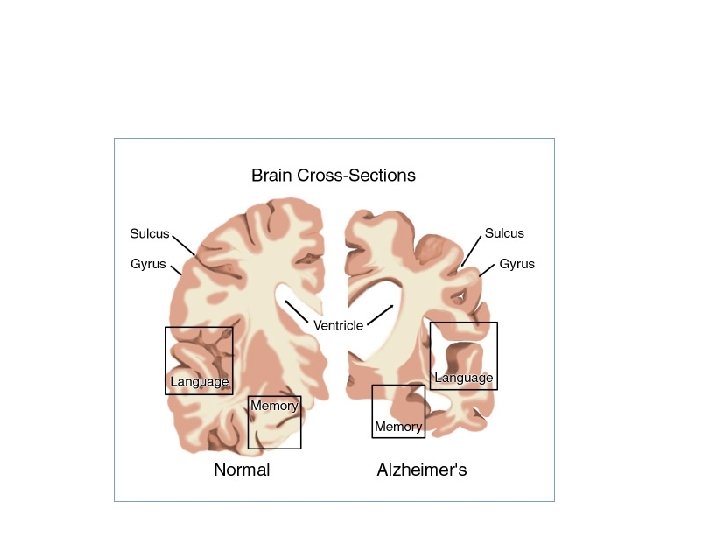 Types and Changes in brain • Familial (follows inheritance pattern) and sporadic • Early-onset (<65) • Older-onset (>65) • Progressive brain atrophy