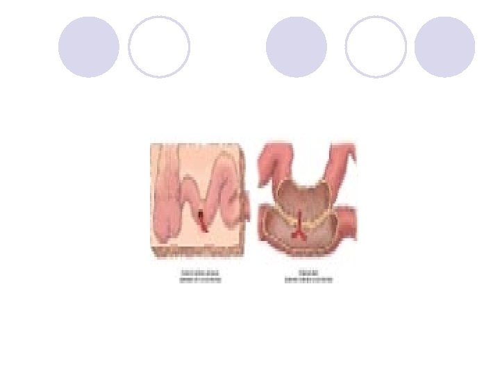 Peptic Ulcer Disease NG suction l Surgical intervention l ¡ Minimally invasive gastrectomy l ¡ Bilroth I and II l ¡ Removal of portions of the stomach Vagotomy l ¡ Partial gastric removal with laproscopic surgery Cutting of the vagus nerve to decrease acid secretion Pyloroplasty l Widens the pyloric sphincter