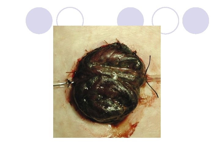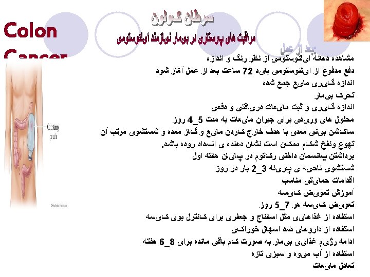 Client with Colorectal Cancer l Post-op care ¡Pain ¡NG tube ¡Wound management l. Stoma • Should be pink and moist • Dark red or black indicates ischemic necrosis • Look for excessive bleeding • Observe for possible separation of suture securing stoma to abdominal wall