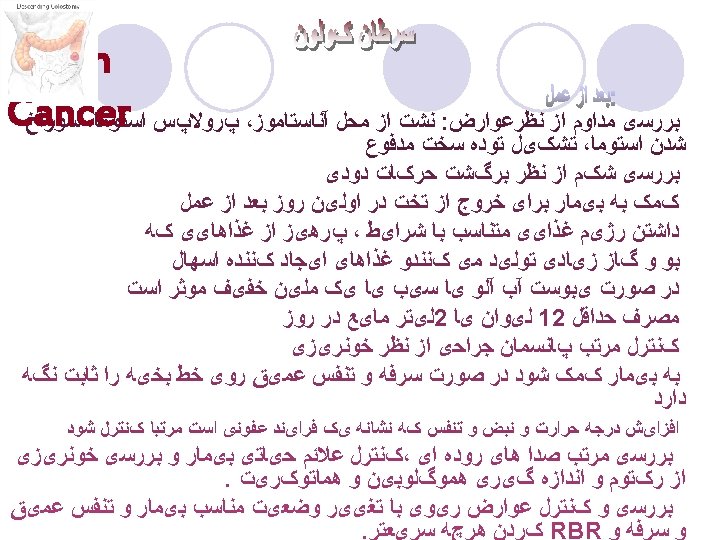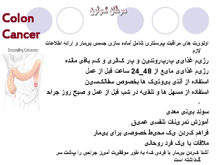 Client with Colorectal Cancer l Pre-op care ¡Consult with ET nurse if ostomy is planned ¡Bowel prep with Go. Lytely ¡NPO ¡NG