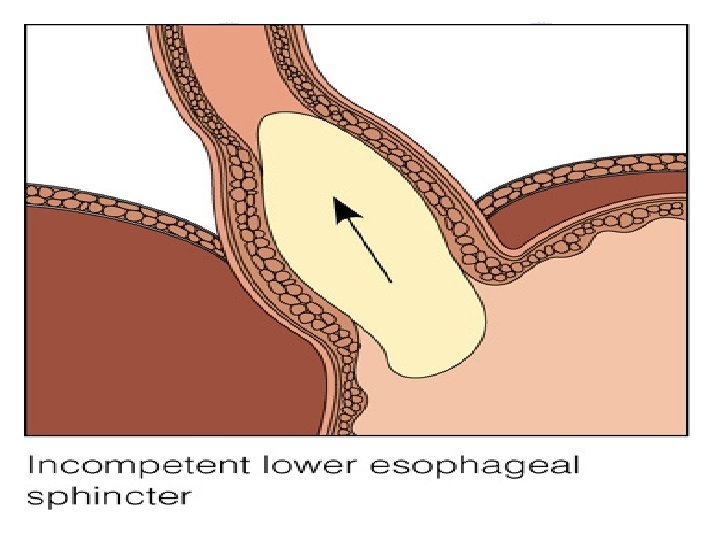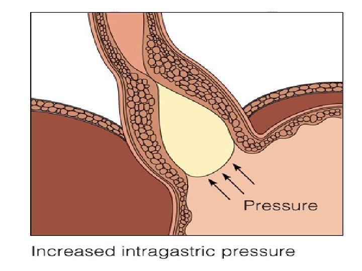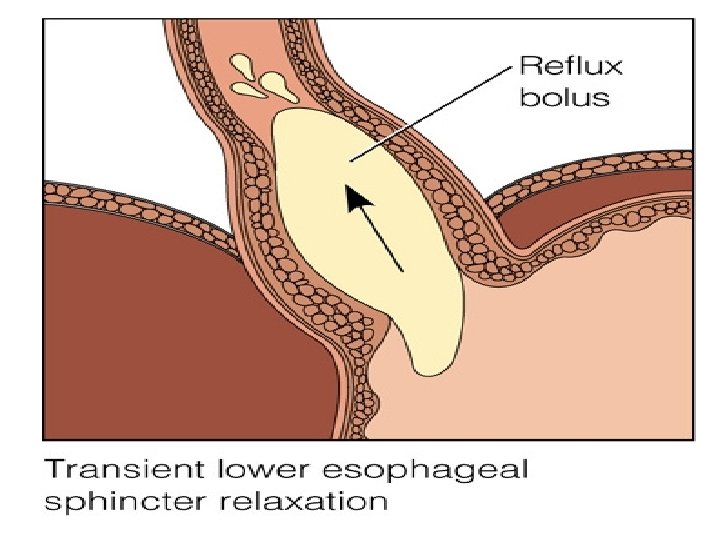 Gastroesophageal Reflux Disease (GERD) 2. Pathophysiology l a. Gastroesophageal reflux results from transient relaxation or incompetence of lower esophageal sphincter, or increased pressure within stomach l b. Factors contributing to gastroesophageal reflux 1. Increased gastric volume (post meals) 2. Position pushing gastric contents close to gastroesophageal juncture (such as bending or lying down) 3. Increased gastric pressure (obesity or tight clothing) 4. Hiatal hernia