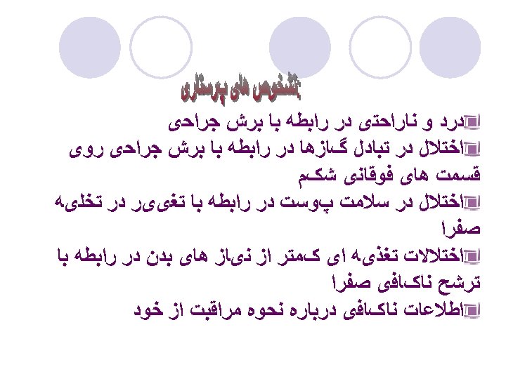 Cancer of Stomach d. Treatment: dietary pattern to delay gastric emptying and allow smaller amounts of chyme to enter intestine l 1. Liquids and solids taken separately l 2. Increased amounts of fat and protein l 3. Carbohydrates, especially simple sugars, reduced l 4. Client to rest recumbent or semi-recumbent 30 – 60 minutes after eating l 5. Anticholinergics(hyosin), sedatives, antispasmodic medications may be added(colofac) l 6. Limit amount of food taken at one time