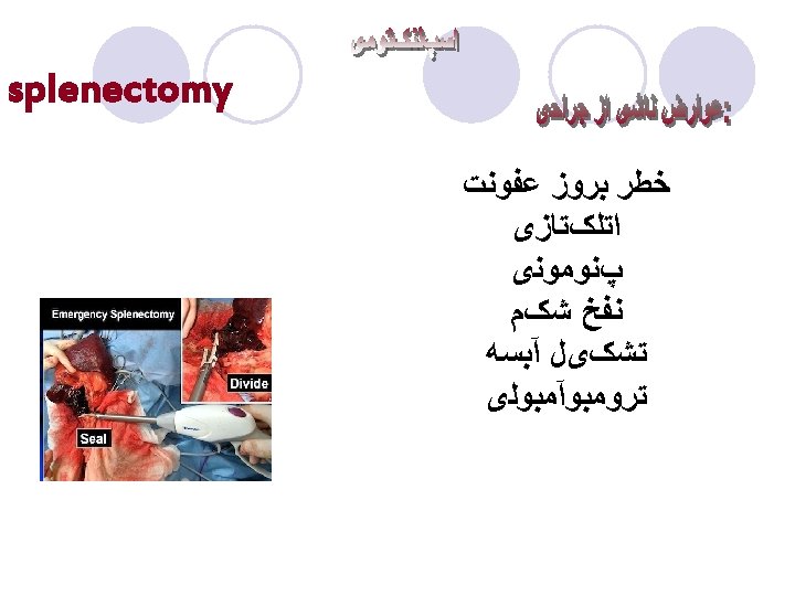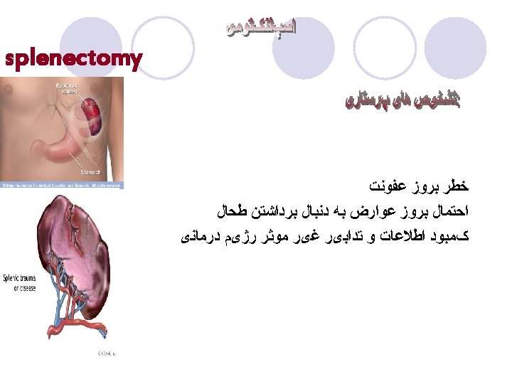Peritonitis 9. Treatment l a. Intravenous fluids and electrolytes to maintain vascular volume and electrolyte balance l b. Bed rest in Fowler’s position to localize infection and promote lung ventilation l c. Intestinal decompression with nasogastric tube or intestinal tube connected to suction l 1. Relieves abdominal distension secondary to paralytic ileus l 2. NPO with intravenous fluids while having nasogastric suction