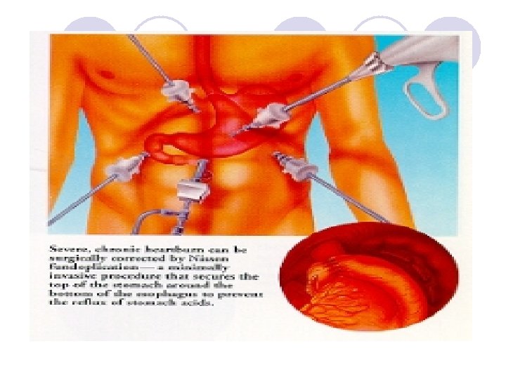 Gastroesophageal Reflux Disease (GERD) 9. Surgery indicated for persons not improved by diet and life style changes l a. Laparoscopic procedures to tighten lower esophageal sphincter l b. Open surgical procedure: Nissen fundoplication 10. Nursing Care l a. Pain usually controlled by treatment l b. Assist client to institute home plan