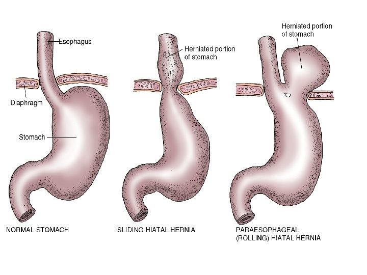 Hiatal Hernia l c. Most cases are asymptomatic; incidence increases with age l d. Sliding hiatal hernia: gastroesophageal junction and fundus of stomach slide through the esophageal hiatus l e. Paraesophageal hiatal hernia: the gastroesophageal junction is in normal place but part of stomach herniates through esophageal hiatus; hernia can become strangulated; client may develop gastritis with bleeding