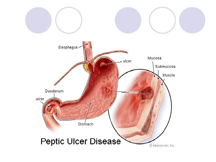Peptic Ulcer Disease (PUD) Definition and Risk factors l a. Break in mucous lining of GI tract comes into contact with gastric juice; affects 10% of US population l b. Duodenal ulcers: most common; affect mostly males ages 30 – 55; ulcers found near pyloris l c. Gastric ulcers: affect older persons (ages 55 – 70); found on lesser curvature and associated with increased incidence of gastric cancer l d. Common in smokers, users of NSAIDS; familial pattern, ASA, alcohol, cigarettes