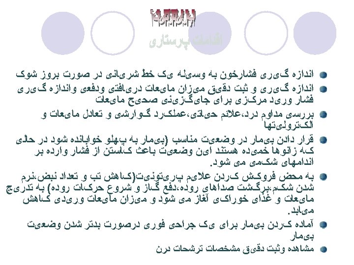 Peritonitis l d. paralytic ileus; l bowel sounds are diminished or absent l distention; nausea and vomiting l e. Systemically: fever, malaise, tachycardia and tachypnea, restlessness, disorientation, oliguria with dehydration and shock l f. Older or immunosuppressed client may have 1. Few of classic signs 2. Increased confusion and restlessness 3. Decreased urinary output 4. Vague abdominal complaints 5. At risk for delayed diagnosis and higher mortality rates