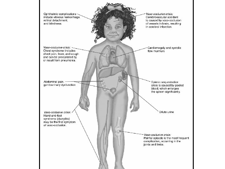 Pathophysiology of Sickle Cell Anemia (cont) Ø Large tissue infarctions occur Ø Damaged tissues in organs; impaired function: ØSplenic sequestration ØMay require splenectomy at early age ØResults in immunity