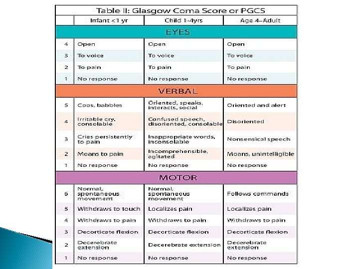 Electroencephalogram (EEG) ◦ Records the electrical activity of the brain through a series of electrodes on the scalp. ◦ Used to diagnose and evaluate seizures disorders, identify tumors, brain abscesses or infections and to confirm of brain death X-ray. ( CT. skull x-ray , & MRI ) Ultrasound (Echoencephalography): to create images of blood vessels, tissues, and organs. Assess brain blood flow Glasgow Coma Scale.
