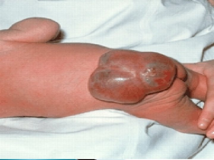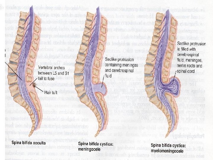 Spina Bifida: Failure of osseous spine to close. Vertebral column fails to close during intrauterine development. Two types: 1) Spina bifida occulta: Not visible externally. 2) Spina bifida cystica: Visible defect with a Sac-like protrusion; Two types: a) Meningocele: Sac contains meningies and spinal fluid but no neural elements (with no neurologic defects). No paralysis because spinal cord is not involved. b) Myelomeningocele: Clinically is called “spina bifida”. Sac contains meningies, spinal fluid, and nerves. Extent of paralysis depends on the location of the defect. If below 2 nd lumber Flaccid paralysis of lower extremities and Sensory deficit occur.