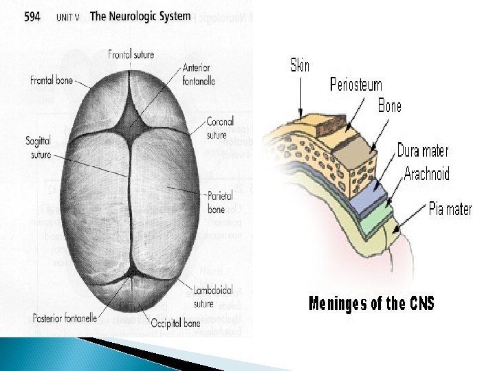 The brain is covered by three lyres (the meninges: dura mater, archniod, & pia mater. Cerebrospinal fluid circulation (6 hrs): produced in pia mater- circulate within the ventricles of the brain & around the brain & spinal cordthen reabsorbed by the archniod layer. CSF is 5 ml in a neonate and 150 ml in an adult Brain size is 25% of adult size at birth, and 90% of adult size at age 5. By 12 years of age the sutures are completely ossified & can not be separated.
