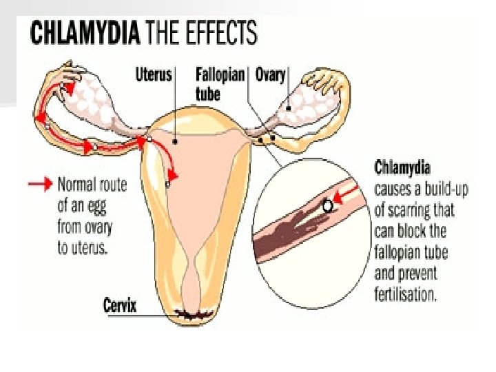 Chlamydia n Treatment: can be cured with antibiotics – Doxycycline is tx of choice n If Untreated: – males - inflammation of testicles, infected prostate – females - pelvic inflammatory disease, ectopic pregnancies – both sexes - sterility – fetus/newborns -pneumonia, death, eye & ear infections