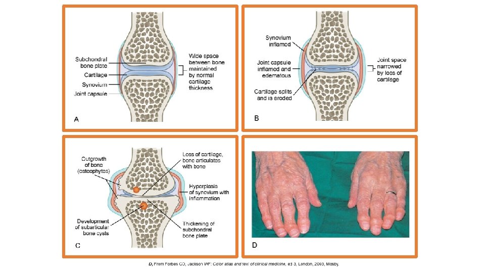 Osteoarthritis Rheumatoid Arthritis Affected Joints. Often asymmetric, weight - Usuallysymmetrical, small bearingjoints first 7 Deformity Heberden’s (DIP) and Ulnardrift, swan neck, Bouchard’s (PIP) nodes. Boutonnière , subluxation Disease Localized disease with variable, progressive course Clinical Manifestations Systemic disease with exacerbations and remission