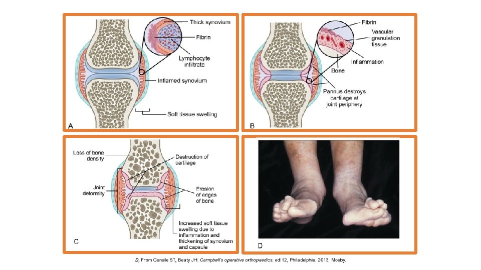 Typical deformities of rheumatoid arthritis. A, Ulnar drift. B, Boutonnière deformity. C, Hallux valgus. D, Swan neck deformity.