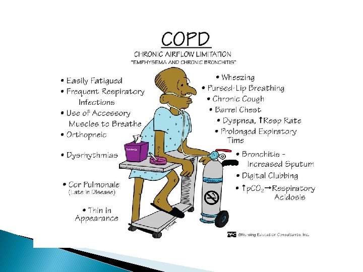 Management of COPD Activity intolerance Encourage pt to pace activities Provide as much self-care as possible Instruct not to rush through morning activities Assess pt response to activities (skin color, vital signs, etc. ) ◦ Provide supplemental oxygen during high energy activities as necessary ◦ ◦