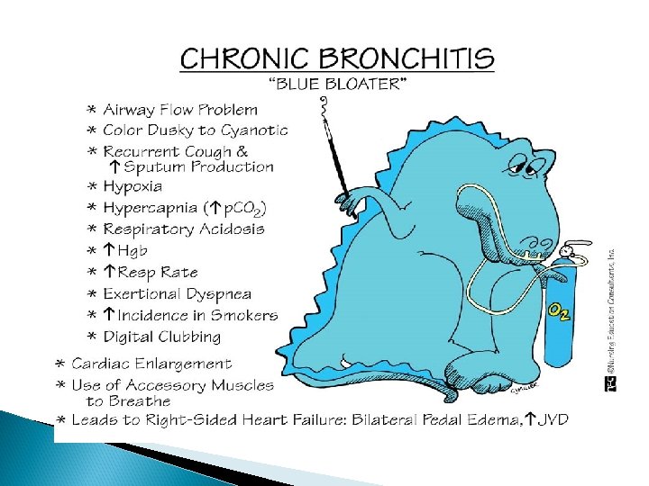 Complications of COPD Cor pulmonale or right-sided hart failure Key features of Cor Pulmonale ◦ ◦ ◦ ◦ ◦ Hypoxia & hypoxemia Increasing dyspnea Enlarged & tender liver Warm , cyanotic extremities with bounding pulse Fatigue Cyanotic lips Right ventricle enlargement (hypertrophy) Distended neck veins weakness