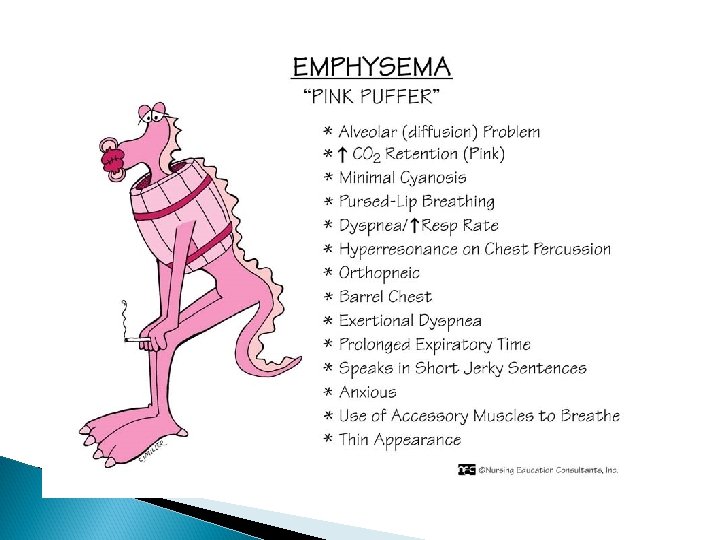 Emphysema Gas exchange is affected Often inhalation starts before exhalation is completed, resulting in uncoordinated pattern of breathing Air hunger Client ↑ respiration rate. CO 2 is produced faster than can be eliminated resulting in → CO 2 retention and chronic respiratory acidosis