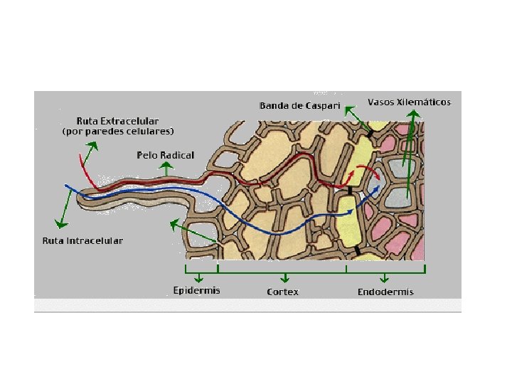 • CAMINOS DE ENTRADA - - VÍA TRANSCELULAR O SIMPLASTICA ( a través de células) La concentración de sales en el suelo es menor (hipotónico), para el paso de sales a las células se necesita transporte activo, el agua pasa por ósmosis. VIA EXTRACELULAR O APOPLASTICA ( entre los espacios de las células) La mayoría entra de esta forma, pero al llegar a la endodermis, los espacios están sellados por las bandas de caspari (suberina) y no puede seguir, y tiene que acabar siendo intracelular.