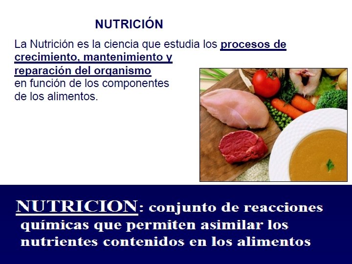 NUTRICIÓN - Conjunto de procesos mediante los cuales el hombre utiliza, transforma e incorpora en sus propias estructuras los nutrientes. - Es el Conjunto de procesos fisiológicos armónicos y coordinados, que ocurren en todas las células.