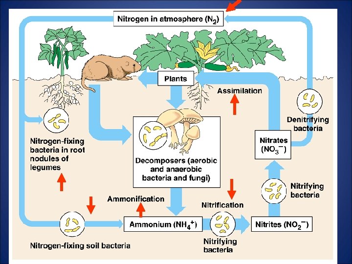 Nitrogen Cycle • N 2 gas is modified by nitrogen fixing bacteria into ammonia (NH 3) (nitrogen fixation) • Bacteria turn nitrogenous waste and detritus into ammonia (ammonification) • NH 3 is converted into nitrite (N 02) which is used to produce nitrate (N 03) (nitrification) • Other bacteria convert nitrite into gas which enters the air (denitrification)