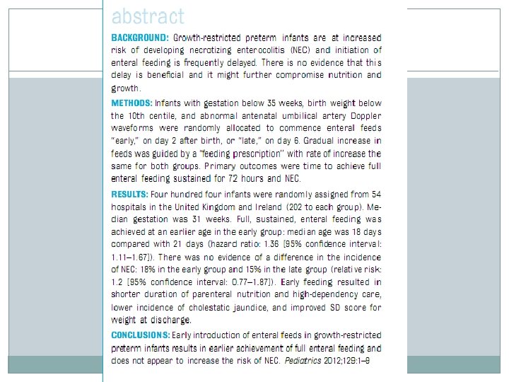 Alimentação enteral mínima reduz o risco de sepse em recém-nascidos de muito baixo peso com intolerância alimentar Autor(es): Terrin G et al. Apresentação: André Mello e Souza, Johnny Emanuel, Suélen Tavares, Paulo R. Margotto Os resultados sugerem que: -a nutrição enteral mínima pode ser uma estratégia eficaz e segura em recém-nascido de muito baixo peso com intolerância alimentar, podendo reduzir o tempo para alcançar a nutrição enteral total e a incidência de sepse, sem aumentar o risco para NEC e para morte -a suspensão da nutrição enteral a partir da detecção do primeiro sinal de intolerância alimentar, representaria um risco cumulativo para sepse e não uma estratégia protetora contra a enterocolite necrosante Logo, ao decidir pela suspensão da nutrição enteral em prematuros com intolerância alimentar, deve-se lembrar que a dieta tem um papel importante no desenvolvimento intestinal e na defesa sistêmica.
