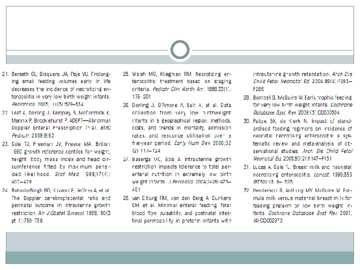 O que é conhecido a respeito do tema: prematuros com crescimento intra-uterino restrito apresentam alto risco de enterocolite necrosante (ECN). A ECN Ocorre mais freqüentemente em crianças que receberam NUTRIÇÃO ENTERAL. É comum a prática de atrasar introdução de nutrição enteral nessas crianças. O que estudo nos informa: A introdução precoce de nutrição enteral resulta em se alcançar mais cedo a nutrição enteral plena. A nutrição enteral precoce não se associa a um maior risco de enterocolite necrosante. O retardo do início da nutrição enteral associa-se a um maior risco de colestase.