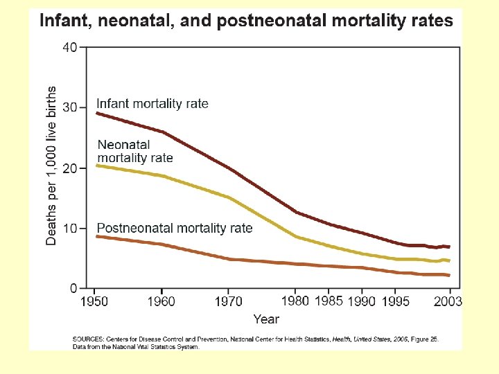 Infant Mortality • Infant mortality rate – Deaths of infants aged under 1 year per 1, 000 or 100, 000 live births. The infant mortality rate is the sum of the neonatal and postneonatal mortality rates. • Neonatal mortality rate – Deaths of infants aged 0 -27 days per 1, 000 live births. The neonatal mortality rate is the sum of the early neonatal and late neonatal mortality rates • Postneonatal mortality rate – Deaths to infants aged 28 days-1 year per 1, 000 live births.