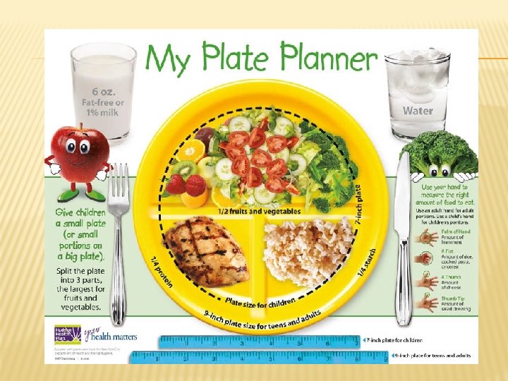 GOALS OF MY PLATE � Variety – eat foods from all food groups � Proportionality – Eat more of some foods (fruit, vegetables, whole grains, fat-free, or low-fat milk products and less of other foods (high-saturated fats, added sugars, and sodium) � Moderation – choose forms of foods that limit saturated or trans fats, added sugars and salt. � Activity – be physically active every day!