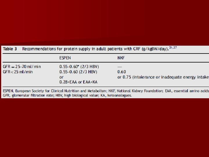 CRF Diet therapy n Protein restriction (0. 5 -0. 8 mg/kg/d) n Adequte intake of calories(30 -35 kcal/kg/d) n Fluid intake: urine volume +500 ml n Low phosphate diet(600 -1000 mg/d) n Supplement of EAA(ketosteril)