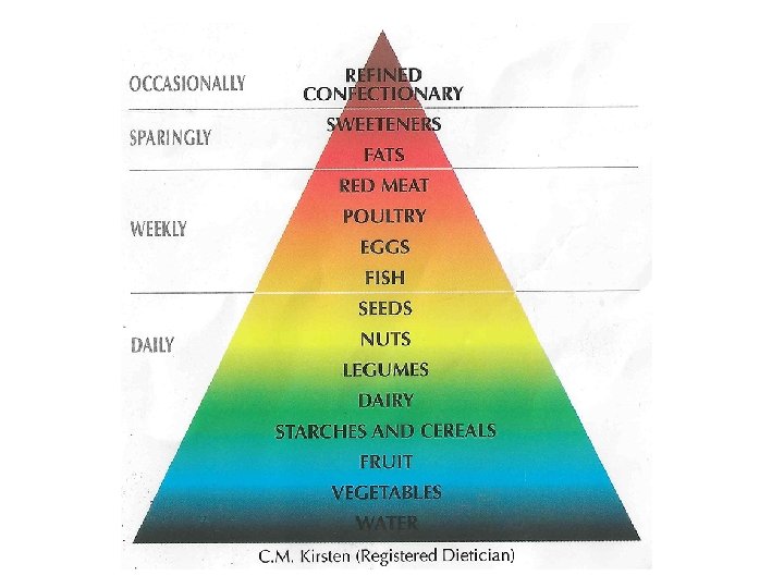 Dairy Products • Very important source calcium, Bvitamins, vitamin A , D and protein. • Not essential in adult diet- easily replaced • Vitamin D- deficiency may cause hypertension, CVD, Heart Failure, Peripheral Arterial Disease • Calcium supplement • For cholesterol lowering purposes and weight management, low fat is best. • Nutritious, Organic vs non-organic • r. BST free, free antibiotics, free range
