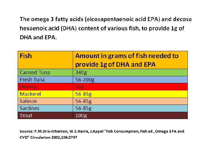 Fatty acid supplements Dosage: 1000 mg ( EPA and DHA) omega 3 fatty acid for CHD patients. 2 -4 g EPA and DHA per day for triglyceride lowering effect. Non cardiac patients 1000 mg/day of EPA and DHA. OR eat oily fish 2 x per week (rich in linolenic acid) also include flaxseed, canola oil, soybean oil, flaxseeds and walnuts. Caution: contraindicated if on blood thinners Cholesterol lowering properties higher in fish source of oil than plant (more active molecules and body just absorb) Omega 6 fatty acids: 1000 mg / day Star flower, flax seed oil, evening primrose oil.